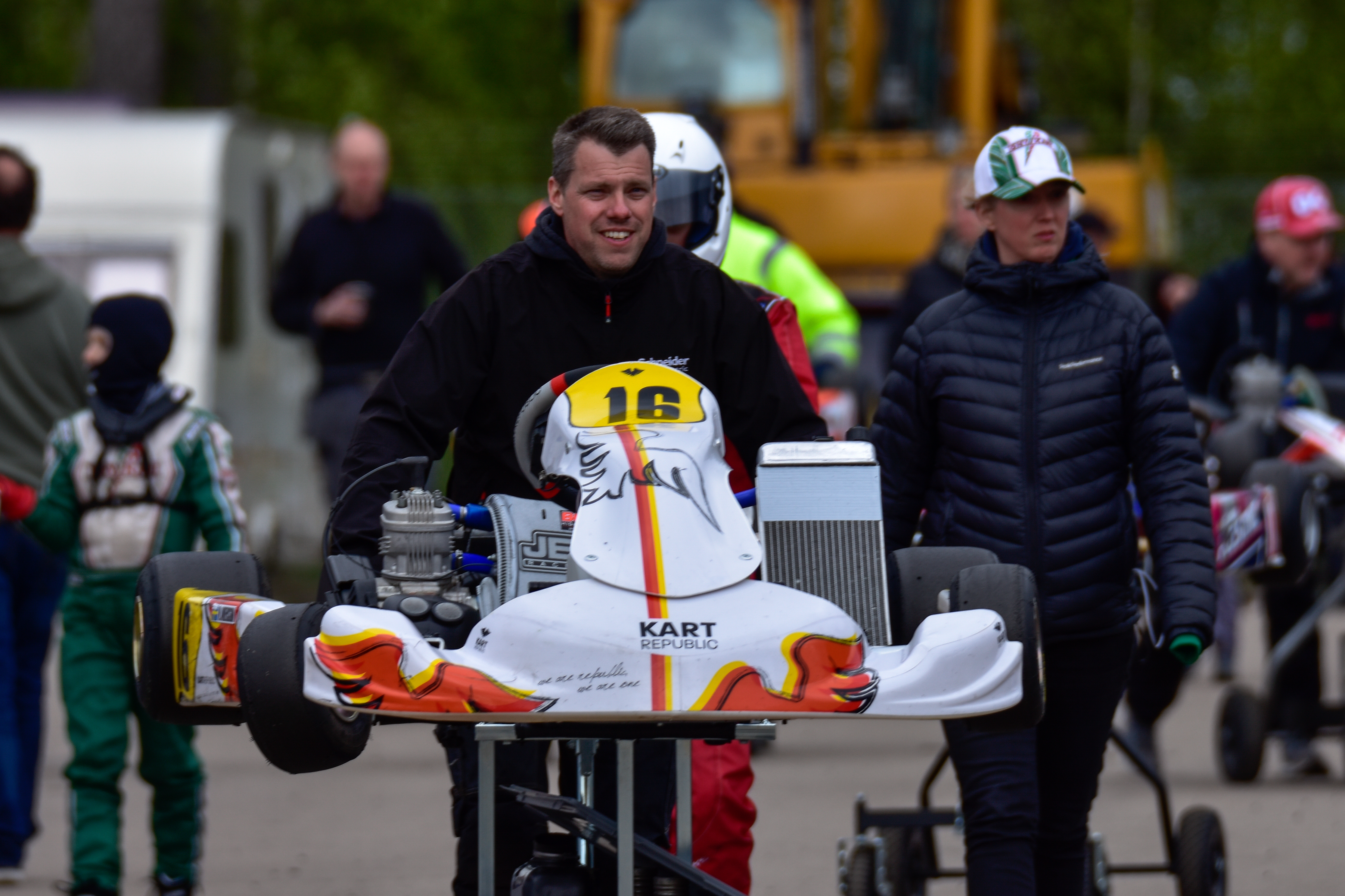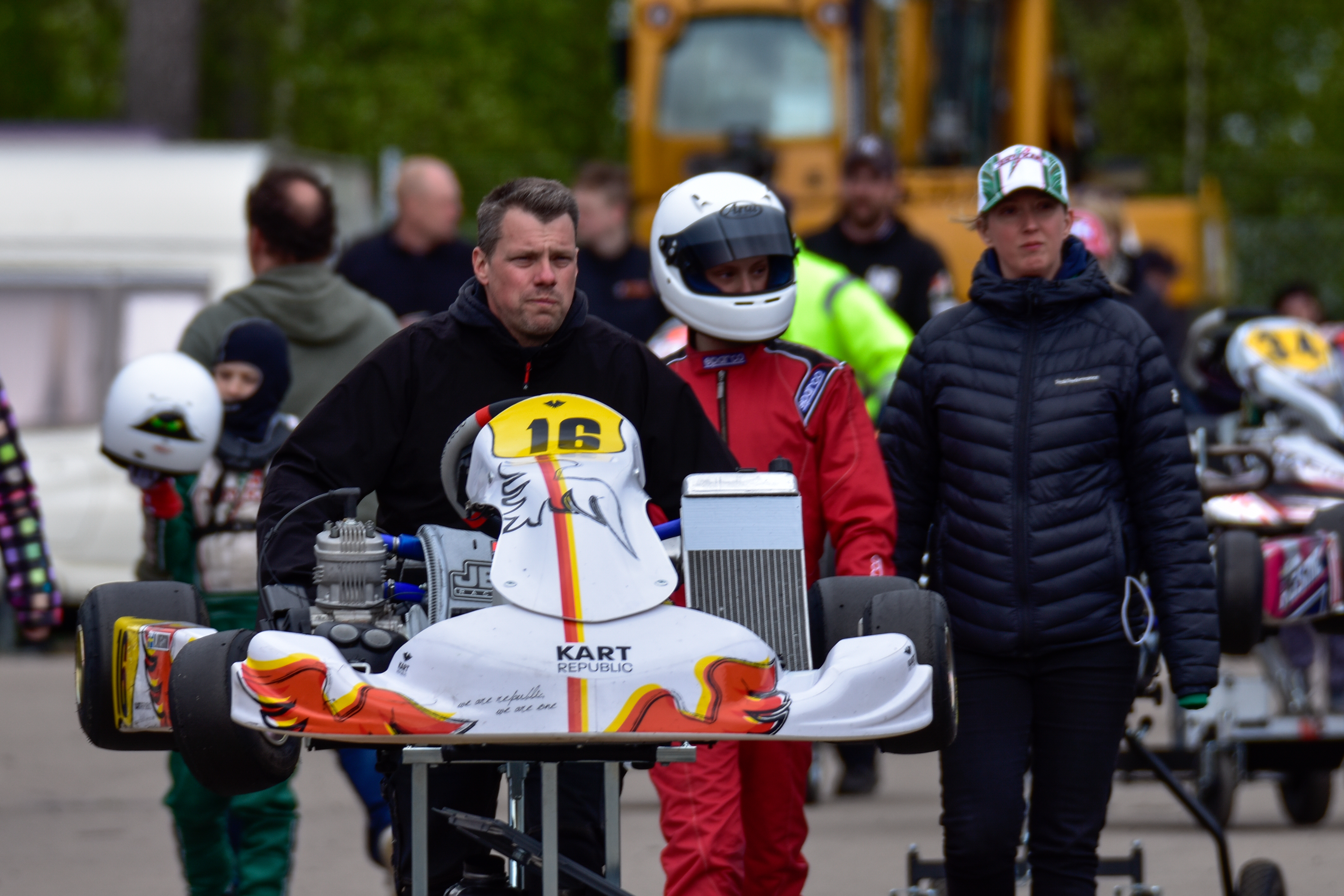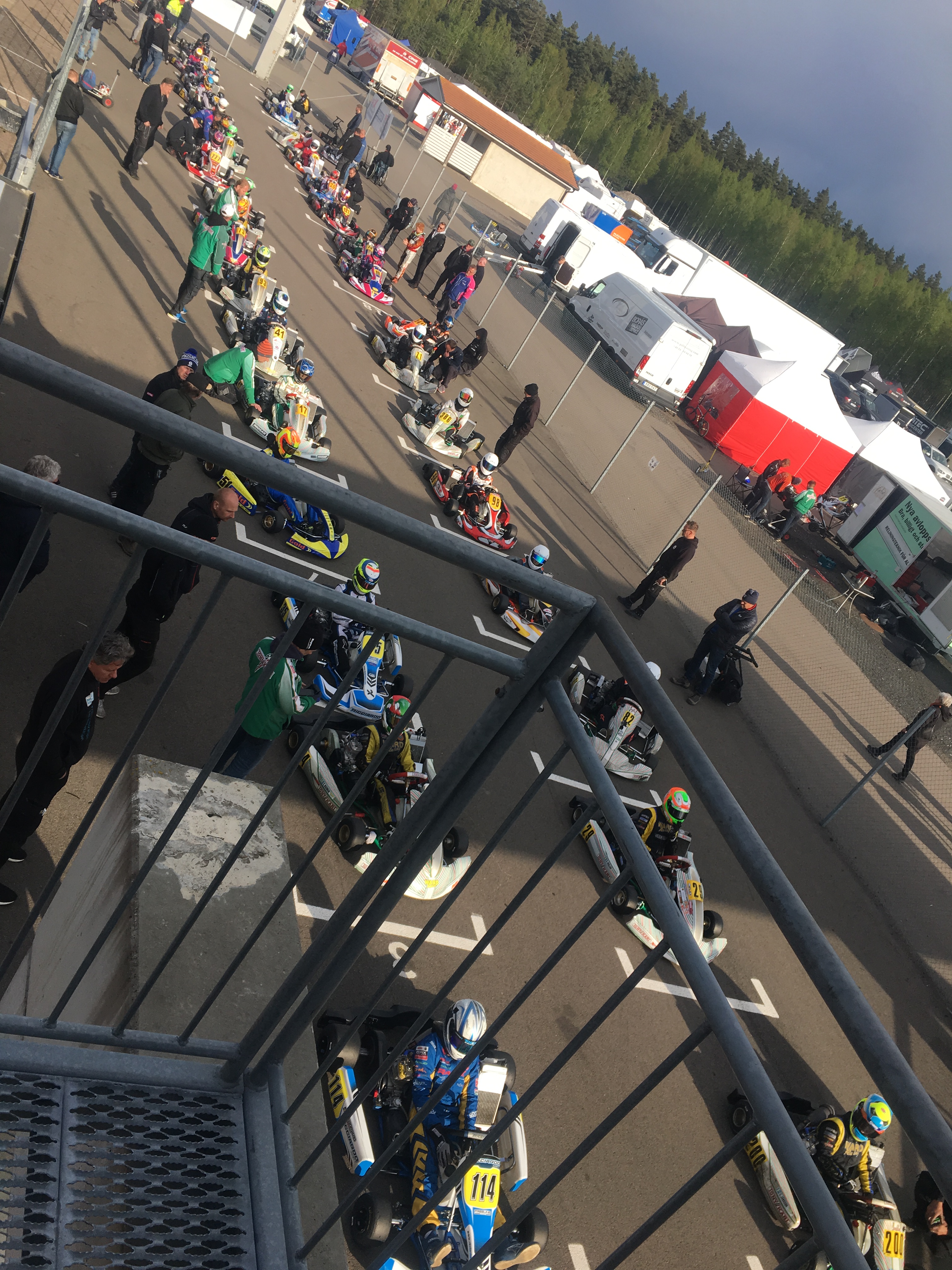 Idag testade vi ett nytt chassi, Kart Republic. Lite ovant inledningsvis, det var mycket nytt att lära om men det gick bättre och bättre. 36 tävlanden i J-125, tävlingen hade fått dispens att ha alla 36 förare i samma förfinal och final. Grymt trångt på banan, och många avåkningar och kraschar. Vädret var ganska ostadigt och regnet hängde i luften. Max var inte nöjd med sin placering, han kom 23:a av 36 tävlanden. Han fick dessutom sin första skriftliga varning ”ojust körning” p g a en omkörning i ett av kvalheaten med motiveringen att # 16 körde på #?? och vann en placering. Vi föräldrar var nöjda med helgen, såväl förare som mekaniker gjorde flera framsteg idag.